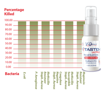Mupirocin Resistant Staphylococcus Aureus (MuRSA) was studied. It was found that the Vitastem First Aid Antibiotic preparation killed more than 99.0% of E.coli, P. Aeruginosa, MRSA, MSSA, & MuRSA and greater than 98.0% of CNSA.